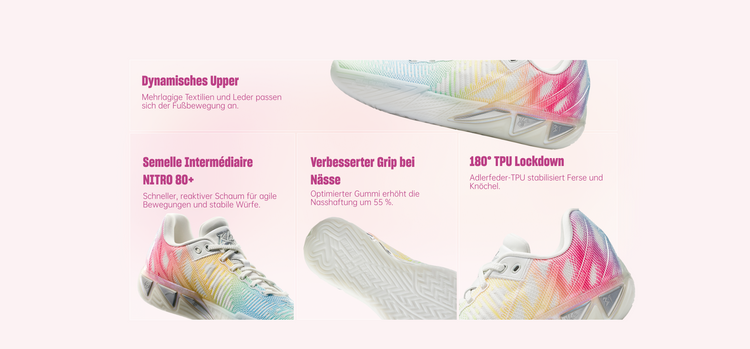 Die ANTA KT11 Basketballschuhe sind für bewegungsbasierte Shooter entwickelt. Mit der reaktionsfreudigen NITRO 80+ Dämpfung, einer 180°-TPU-Fersenfixierung und einer leichten Liquid-Rubber-Außensohle liefern sie explosive Geschwindigkeit, Stabilität und Präzision — geprägt vom Spielstil von Klay Thompson.