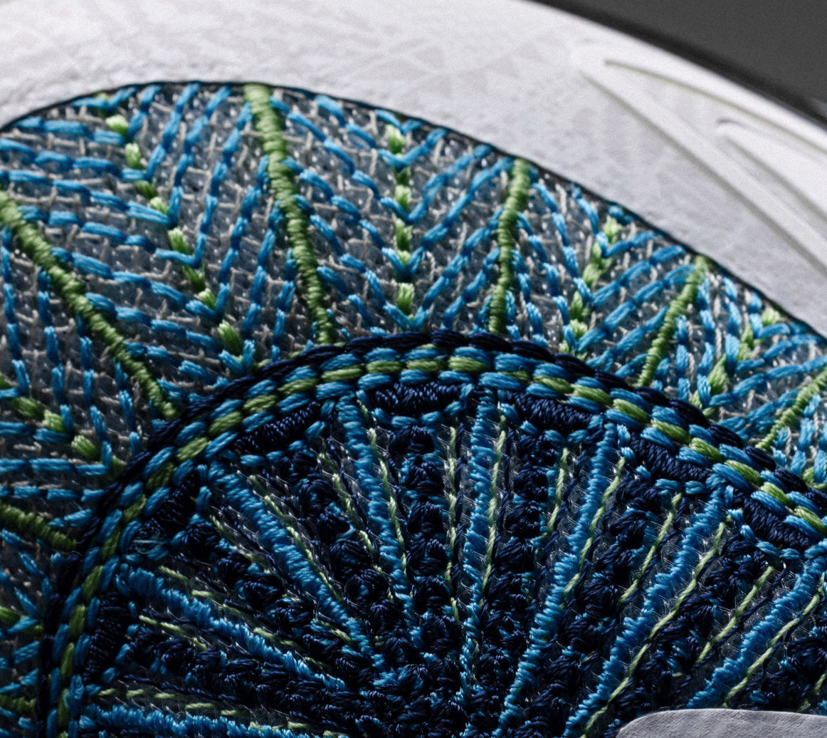 Le capuchon supérieur arbore le tissage emblématique d'inspiration amérindienne de la collection « Artists on Court », dans une nouvelle combinaison de couleurs : bleu profond et vert secret.