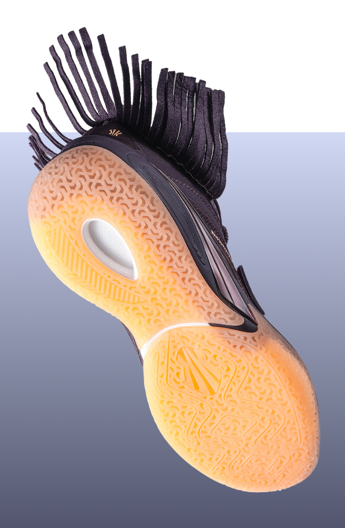 La semelle extérieure aux tons naturels présente une texture organique qui ancre la silhouette à la fois dans le rituel et la performance.