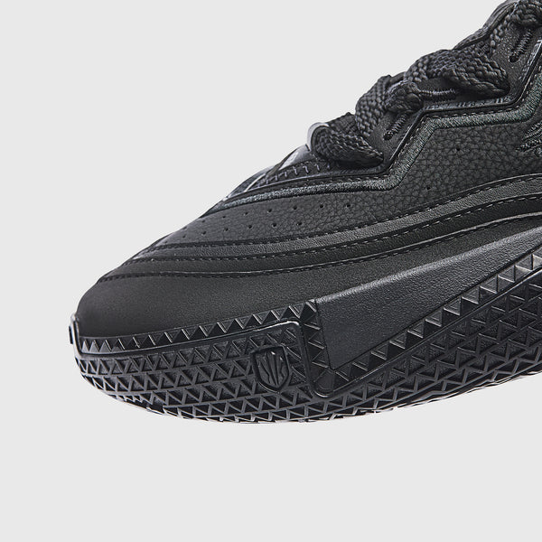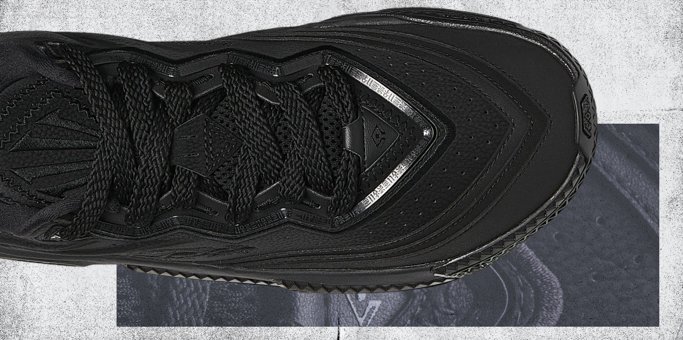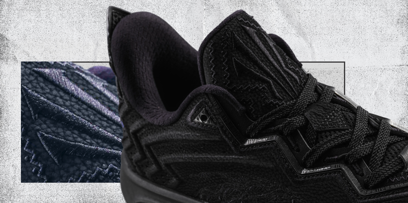 La tige entièrement noire révèle un subtil éclat façon onyx sous les variations de lumière — discrètement puissante, fluide et précise, à l’image du tir tout en douceur de Kyrie Irving sur le terrain.