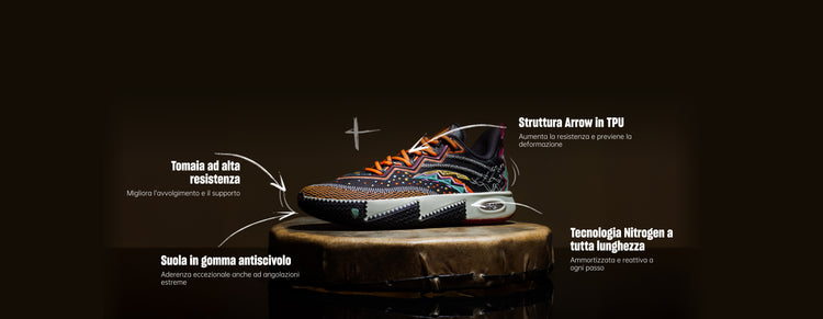 I punti multicolore presenti sulla scarpa rappresentano la più piccola forma di luce — le particelle — simbolo della presenza di Kyrie in campo: brillante, fluida e onnipresente.